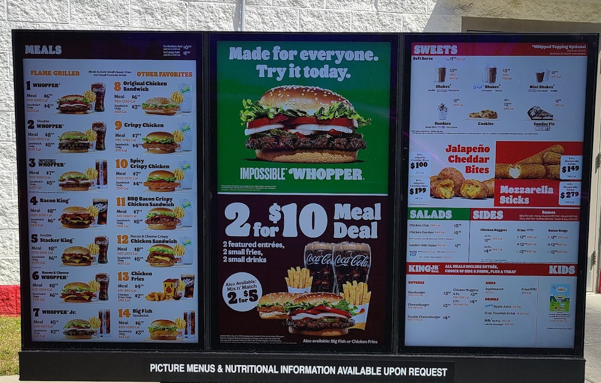 (4) Whopper Sandwiches or Original Chicken Sandwiches, (4) Medium Fries or Medium Onion Rings (Comes with one Zesty dipping sauce), (1) 8 Pc. Nuggets (Comes with choice of up to two sauces)